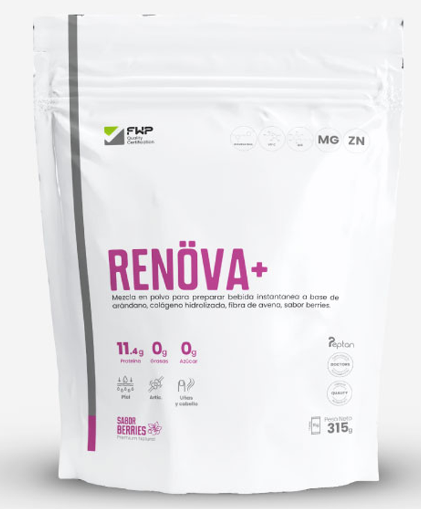RENÖVA+ es un suplemento nutricional premium a base de colágeno hidrolizado con biopéptidos activos, reforzado con resveratrol, coenzima Q10, vitaminas y minerales, diseñado para apoyar la regeneración celular, la salud de la piel, las articulaciones y el bienestar general.