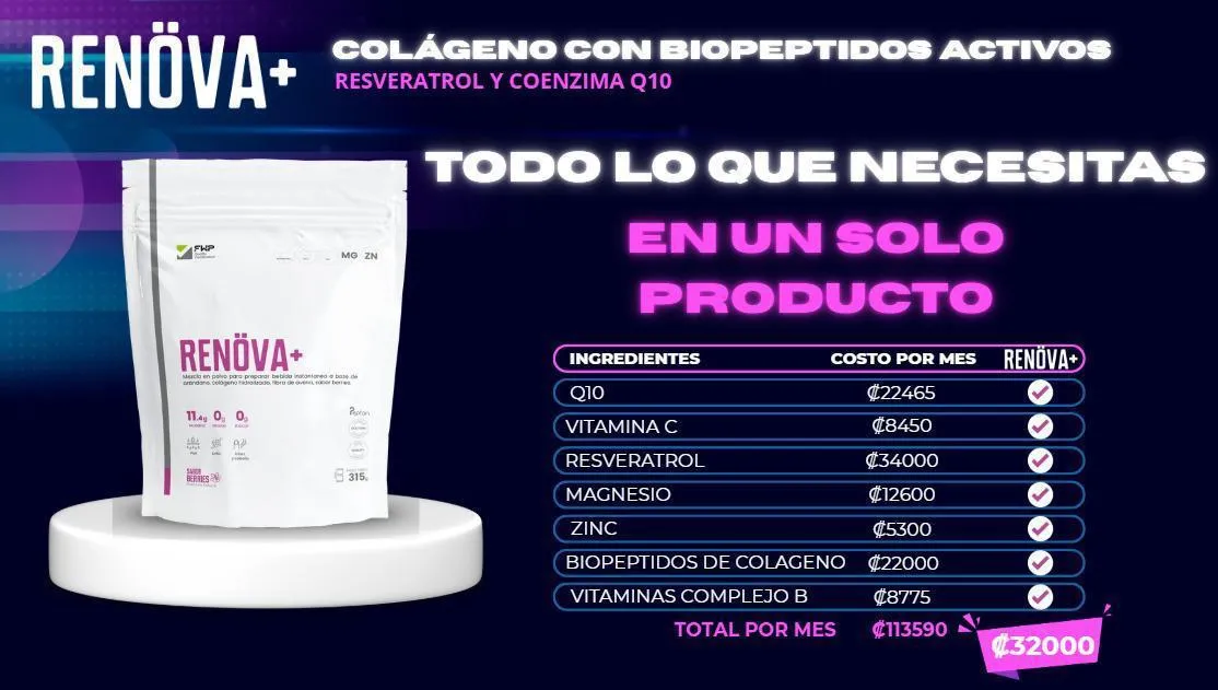 RENÖVA+ es un suplemento nutricional premium a base de colágeno hidrolizado con biopéptidos activos, reforzado con resveratrol, coenzima Q10, vitaminas y minerales, diseñado para apoyar la regeneración celular, la salud de la piel, las articulaciones y el bienestar general.